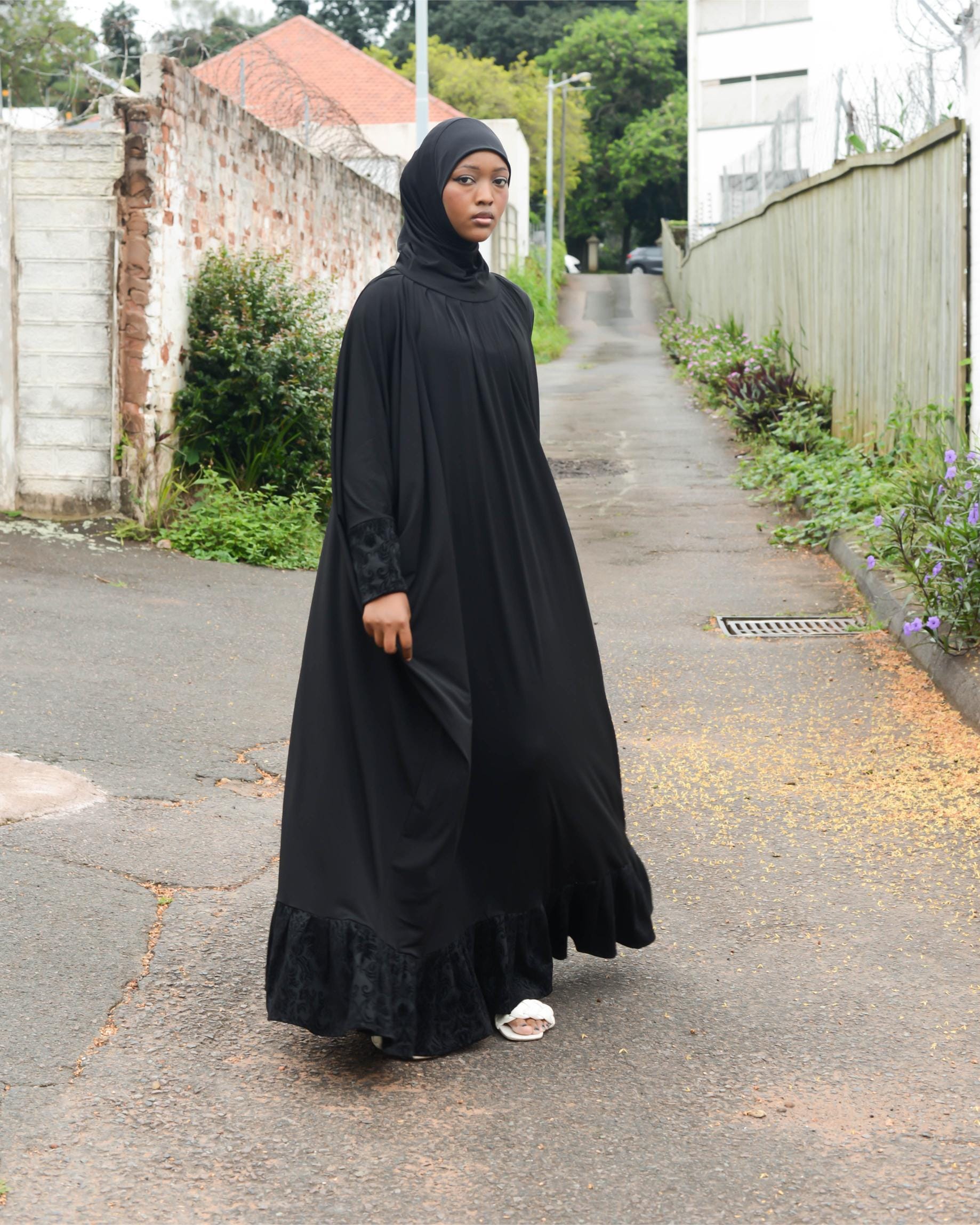Elegance meets modesty in our stunning jilbab. Come experience the perfect blend of style and spirituality in our beautifully crafted jilbabs. This has been specifically tailored for you, the modern Muslimah. Wrap yourself in serenity with our flowy designs and intricate details. Our jilbabs have been designed to fit comfortably and snugly around your head without it pulling on your hairline or sliding backwards. Neither do you need any safety pins under your chin. Elasticated cuffs make it easy for you to make your wudhu, when you busy in the kitchen or an activity. We used almost four meters of fabric to ensure that nothing clings to you. A frill at the bottom and an additional loose hood in a complimentary fabric lends this jilbab an air of elegance allowing you to run out to fetch the kids, run an errand, attend madressah, taleem or Taraweeh. Our jilbabs were made for you and me. Self embossed black.