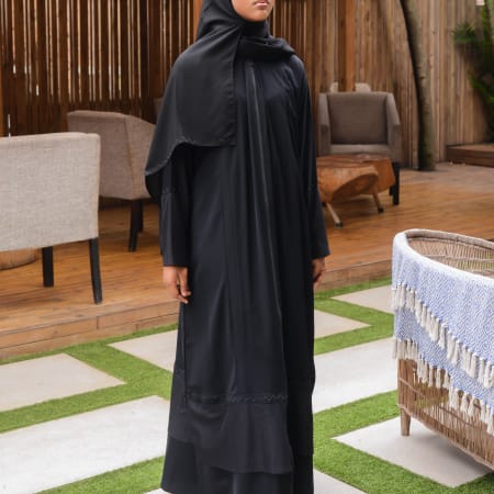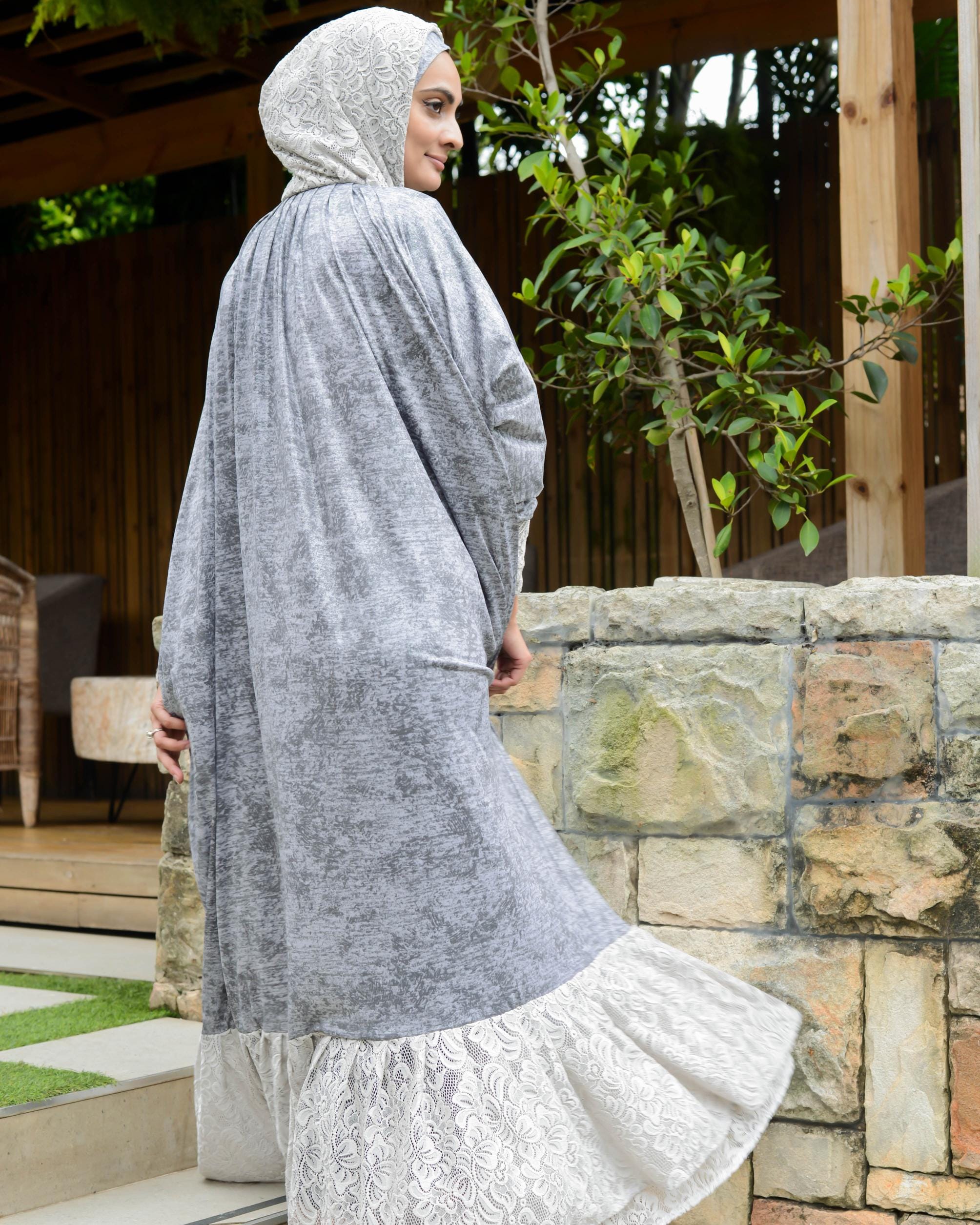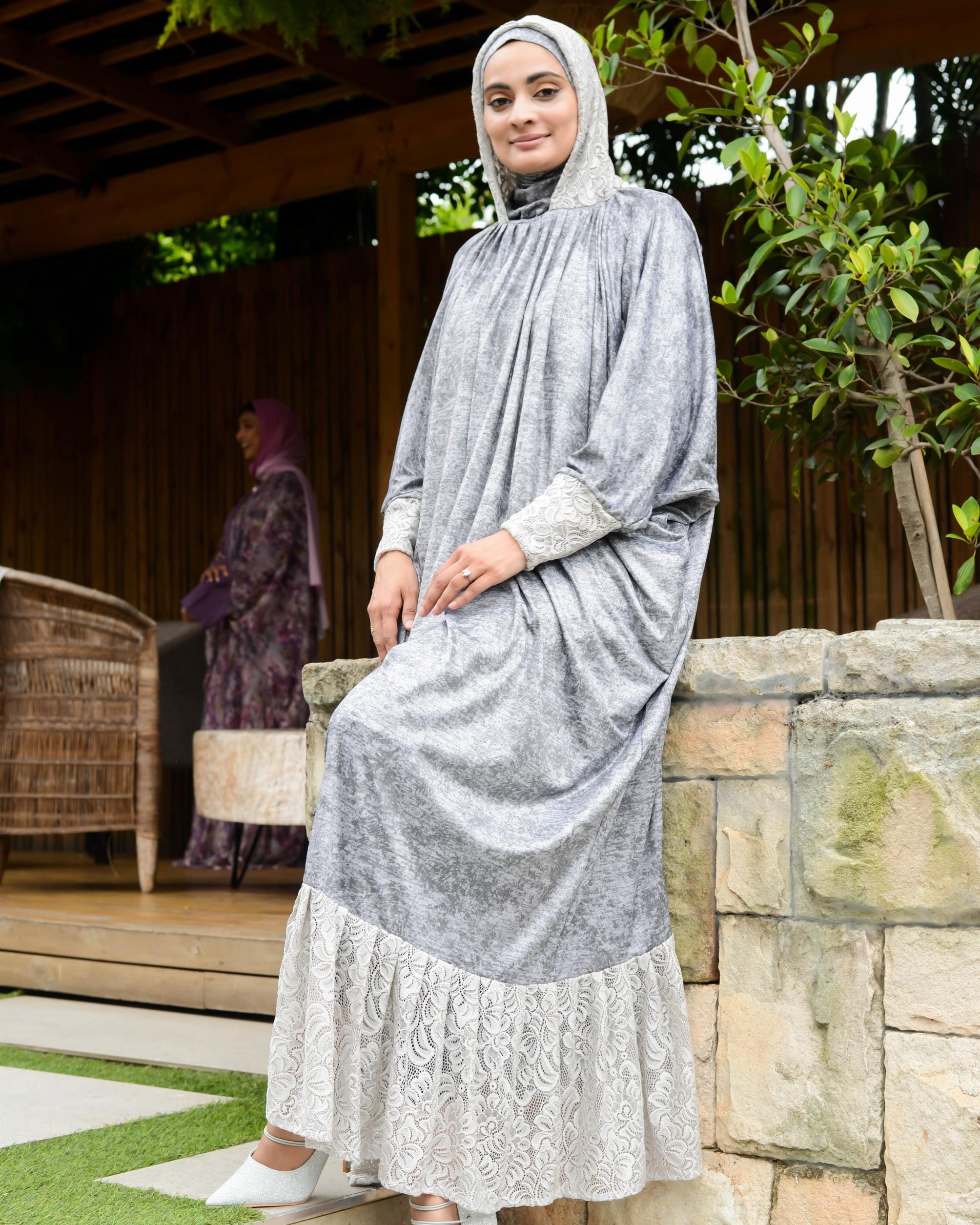 Elegance meets modesty in our stunning jilbab. Come experience the perfect blend of style and spirituality in our beautifully crafted jilbabs. This has been specifically tailored for you, the modern Muslimah. Wrap yourself in serenity with our flowy designs and intricate details. Our jilbabs have been designed to fit comfortably and snugly around your head without it pulling on your hairline or sliding backwards. Neither do you need any safety pins under your chin. Elasticated cuffs make it easy for you to make your wudhu, when you busy in the kitchen or an activity. We used almost four meters of fabric to ensure that nothing clings to you. A frill at the bottom and an additional loose hood in a complimentary fabric lends this jilbab an air of elegance allowing you to run out to fetch the kids, run an errand, attend madressah, taleem or Taraweeh. Our jilbabs were made for you and me. Basheera’s Self embossed grey for the win.
